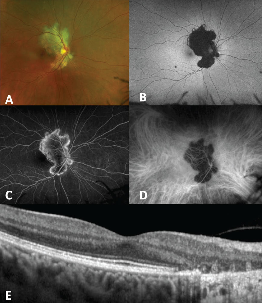 | Figure 1. Serpiginous choroiditis. A) Fundus photo shows a gray-white geographic lesion extending from the optic nerve. B) Fundus autofluorescence shows hyperautofluorescence at active areas of the lesion with hypoautofluorescent center where disease is currently inactive. C) Fluorescein angiography shows late hyperfluorescence of lesion edges. D) Indocyanine green angiography shows hypoautofluorescence throughout the lesion. E) Optical coherence tomography shows disruption of the ellipsoid zone and outer retina, as well as atrophy of the retinal pigment epithelium. |