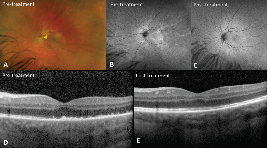 | Figure 2. Acute syphilitic posterior placoid chorioretinitis. A) Fundus photo shows a yellow placoid lesion in the macula. B) Fundus autofluorescence demonstrates hyperautofluorescence corresponding to the placoid lesion that resolves after treatment with intravenous penicillin (C). D) Optical coherence tomography shows punctate spots in the choroid, ellipsoid zone disruption, and a nodular appearance of the retinal pigment epithelium that are restored after treatment (E). |