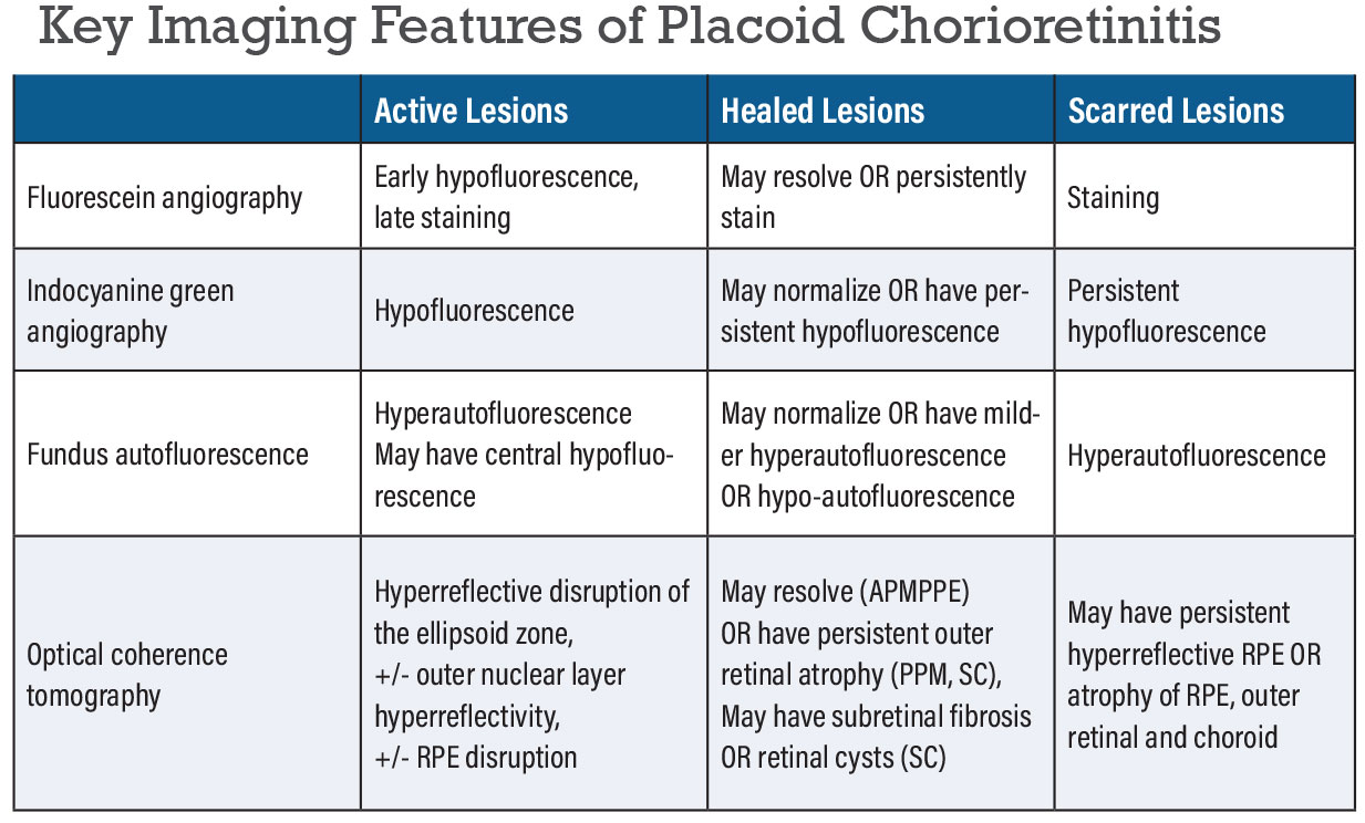 Optical coherence tomography through active placoid lesions shows increased choroidal thickness, hyperreflective disruption of the ellipsoid zone in all cases and variably of the outer nuclear layer and retinal pigment epithelium. Ultimately, there can be recovery of the outer retinal layers in conditions like APMPPE or syphilitic chorioretinitis after treatment. However, in conditions like SLC and RPC, placoid lesions tend to transition to outer retinal atrophy and photoreceptor loss in the inactive stages of the disease (Figure 1E).9,14-16 The OCT findings that are specific to ASPPC include punctate hyper-reflective spots in the choroid and nodular appearing RPE (Figure 2D).17