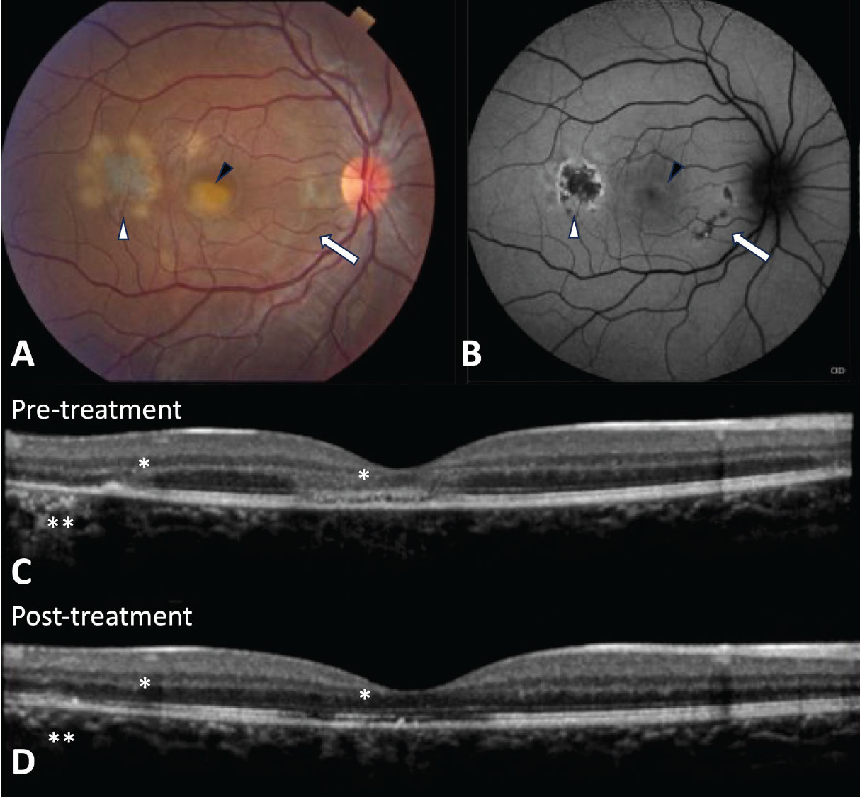 Figure 3. Relentless placoid chorioretinitis (RPC). A) Fundus photo shows creamy yellow/white lesions at the level of the retinal pigment epithelium in the posterior pole that was initially diagnosed as acute posterior multifocal placoid pigment epitheliopathy. However, this patient later returned with new lesions suggesting a diagnosis of RPC. B) Fundus autofluorescence shows a new active lesion in the temporal macula with hyperautofluorescent edges (white arrowhead) and fovea with subtle hyperautoflouresence (black arrowhead) and healed lesions (arrow) that are hypoautoflourescent and minimally apparent on the fundus photo. C) Optical coherence tomography shows hyperreflective disruption of the ellipsoid zone and outer nuclear layer (asterisk) as well as attenuation and hyperreflectivity of the retinal pigment epithelium (double asterisk) that partially recover after treatment with immunosuppression (D). |