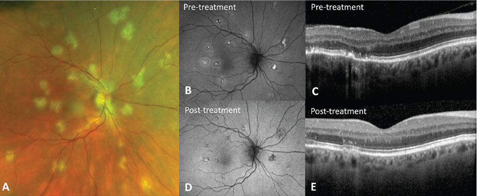 Treatment of infectious placoid chorioretinitis is targeted at the underlying infection with generally good resolution and visual outcomes afterward. Syphilitic chorioretinitis requires treatment with 10 to 14 days of intravenous penicillin, which leads to the resolution of abnormal autofluorescence (Figure 2C) and restoration of the RPE and outer retina on OCT (Figure 2E).17 Placoid chorioretinitis associated with TB or pulmonary histoplasmosis requires anti-TB and anti-fungal therapy, respectively, and may also require adjunctive steroid therapy to control inflammation.