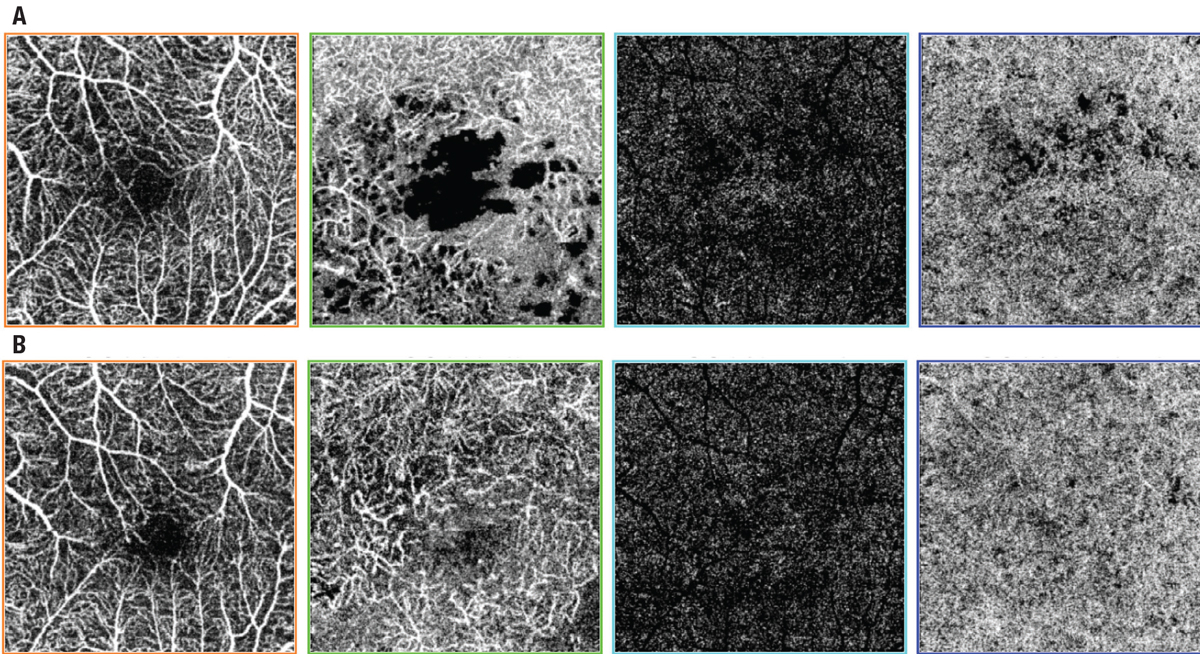 | Figure 1. Swept-source optical coherence tomography angiography scans of diabetic macular edema in a 66-year-old man A) preoperatively and B) one year after surgery. The scans depict, from left to right, superficial retinal vessels, deep retinal vessels, avascular zone and choroid, showing that the foveal avascular zone decreased after surgery in the superficial retinal vessels layer. |
