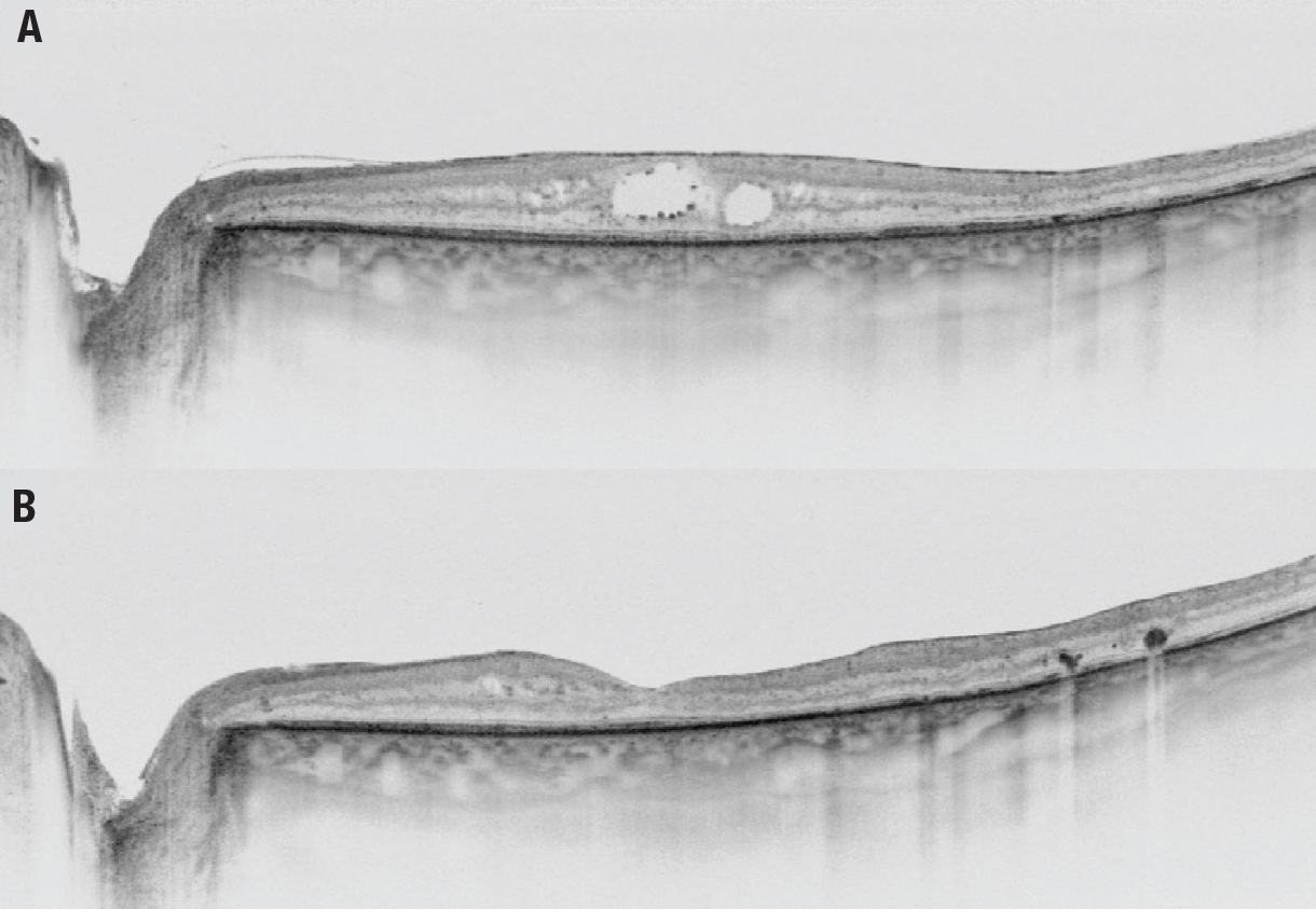 | Figure 2. Swept-source optical coherence tomography of diabetic macular edema in a 66-year-old man A) before surgery and B) one year after surgery. |