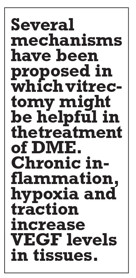 Vitrectomy isn’t intended to be the first-line treatment for DME, but it should be considered for patients who live far from retinal clinics and aren’t able to come in for frequent injections or in patients with financial burdens. Moreover, vitrectomy might be discussed with pregnant women or women planning pregnancy. The obvious indications are the coexistence of traction or epiretinal membranes. Unfortunately, the disease is advanced in these eyes and final results aren’t always satisfactory. Good results after vitrectomy are expected in early-onset disease with subretinal fluid in patients without severe photoreceptor defects. RS