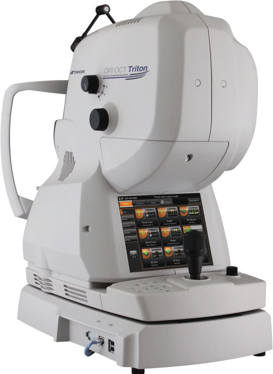 The DRI OCT Triton features a 1-µm, 1,050-nm light source with a scanning speed of 100,000 A-scans/second. It incorporates a built-in retinal camera, eye tracking for selected scans, OCT imaging, color, red-free, fluorescein angiography and fundus autofluorescence imaging with swept-source OCT.