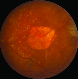 Flash color photographs also identified atrophy, basing its presence on a triad of features: depigmentation, increased visibility of choroidal blood vessels and sharply demarcated borders. Reliable identification of atrophy, however, depended on good quality imaging with excellent stereopsis. Subsequently, researchers have moved to using fundus autofluorescence (FAF) imaging to identify atrophy because it provides better contrast and is less dependent on image quality, but clinical trials of wet AMD have not used this tool thus far.