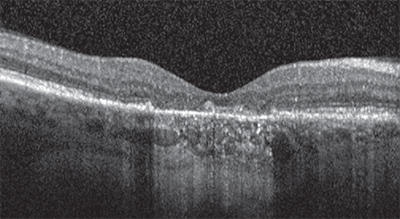 To better understand the characteristics and possible causes of vision loss in patients receiving anti-VEGF therapy, Philip Rosenfeld, MD, PhD, and colleagues retrospectively reviewed data from the Phase III ANCHOR and MARINA trials. They reported that 10 percent of study subjects who received monthly ranibizumab (Lucentis, Genentech) injections lost 15 or more letters of visual acuity (VA) over the course of 24 months.13 By comparison, 38 percent of patients in ANCHOR and 30 percent in MARINA gained at least 15 lines of vision in 24 months.In both trials, vision loss was associated with retinal pigment epithelium (RPE) abnormalities and growth of total lesion area. But these lesions didn’t look like typical advanced wet AMD; rather, they looked more like lesions that the authors speculated might evolve into geographic atrophy (GA). The reason photoreceptor loss occurs in patients who lose vision in the absence of active CNV or the more typical fibrotic scars seen in neovascular AMD is not yet known.