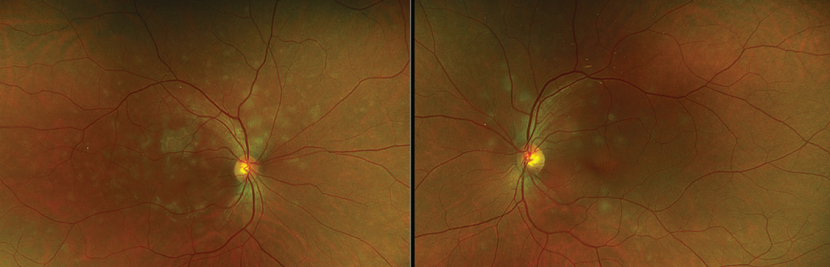 | Figure 1. At the initial presentation, color fundus photos of both eyes demonstrate hypopigmented plaques within the macula and along the arcades. |