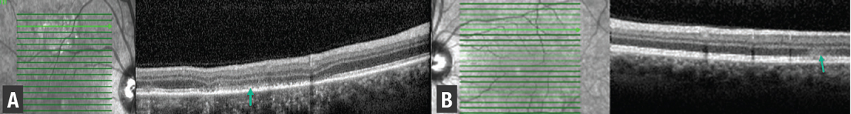 | Figure 3. Spectral-domain optical coherence tomography of the right eye (A) shows areas of ellipsoid zone and retinal pigment epithelium (green arrow) disruption, while left eye scans (B) superior to the fovea demonstrate hyperreflectivity in the outer nuclear layer with underlying EZ attenuation (green arrow). |