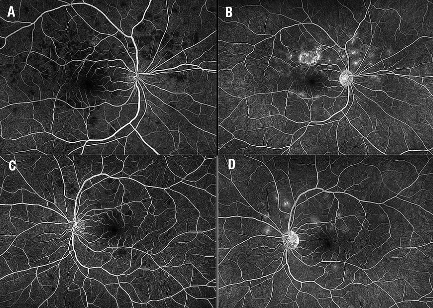 | Figure 5. Intravenous fluorescein angiography shows early (A) blocking and late (B) staining in the right eye with similar findings in the left eye (C, D). |