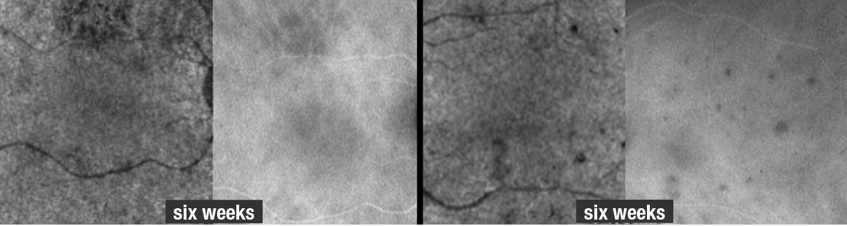 | Figure 6. Optical coherence tomography angiography and indocyanine green angiography of the right and left eyes six weeks after the initial presentation show the lesions had significantly improved but haven’t resolved (compare to Figure 2 for OCTA and ICGA images on initial presentation). A few more spots appear on ICG relative to the OCTA at six weeks, but the extent of improvement can be adequately visualized by both imaging modalities. |