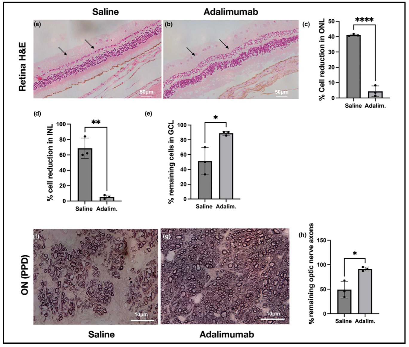 Similarly, TNF-α inhibitors have become the gold standard for treating non-infectious uveitis, offering improved efficacy in suppressing inflammation compared to corticosteroids. Recent studies, including our own, have demonstrated that low-dose subconjunctival administration of adalimumab can prevent uveal and retinal inflammation, improving drug bioavailability to the retina by 10 to 100 times compared to systemic administration.9,10 TNF-α inhibitors have also been shown to reduce ocular neovascularization in animal models, suggesting their potential use in treating neovascular diseases. In the context of alkali burns, TNF-α inhibitors were found to prevent secondary retinal ganglion cell loss and optic nerve degeneration (Figure 1), highlighting new prospects for their use in injuries. With the rapid expansion of biosimilars, TNF-α-targeting antibodies have the potential to revolutionize ocular disease therapy, particularly in terms of retinal protection.