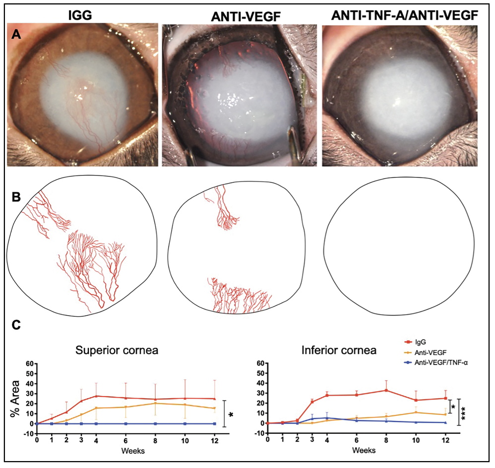 | Figure 2. Therapeutic effect of single subconjunctival administration of anti-TNF-a/anti-VEGF antibodies after severe ocular alkali injury. |
