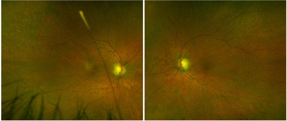 | Figure 1. Fundus examination revealed innumerable yellow-white punctate dots throughout the posterior pole and mid-periphery in both eyes. |