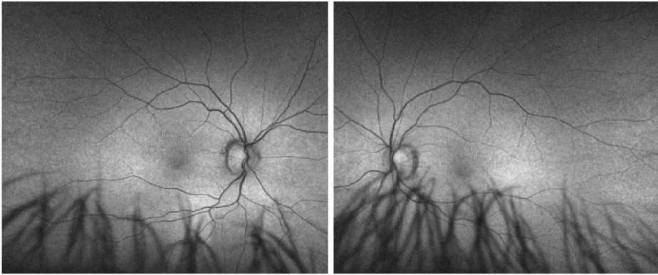 The optic nerves and vasculature were normal in both eyes. Fundus autofluorescence (Figure 2) revealed bilateral stippled hyperautofluorescence. Optical coherence tomography (Figure 3) revealed a jagged ellipsoid zone irregularity with focal hyperreflective excrescences localizing to the spots seen on the fundus examination.