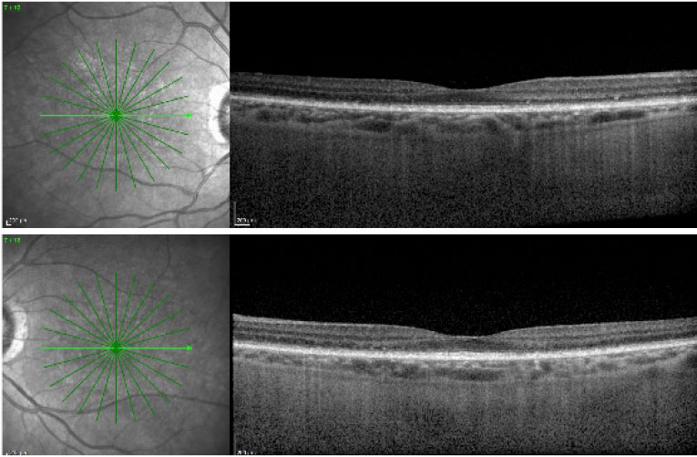 Two months after the initial daily supplementation with oral vitamin A, the patient reported an improvement in night vision. Her visual acuity remained stable at 20/40 in both eyes, and the anterior segment remained normal without signs of xerosis. Fundus examination and OCT remained stable.