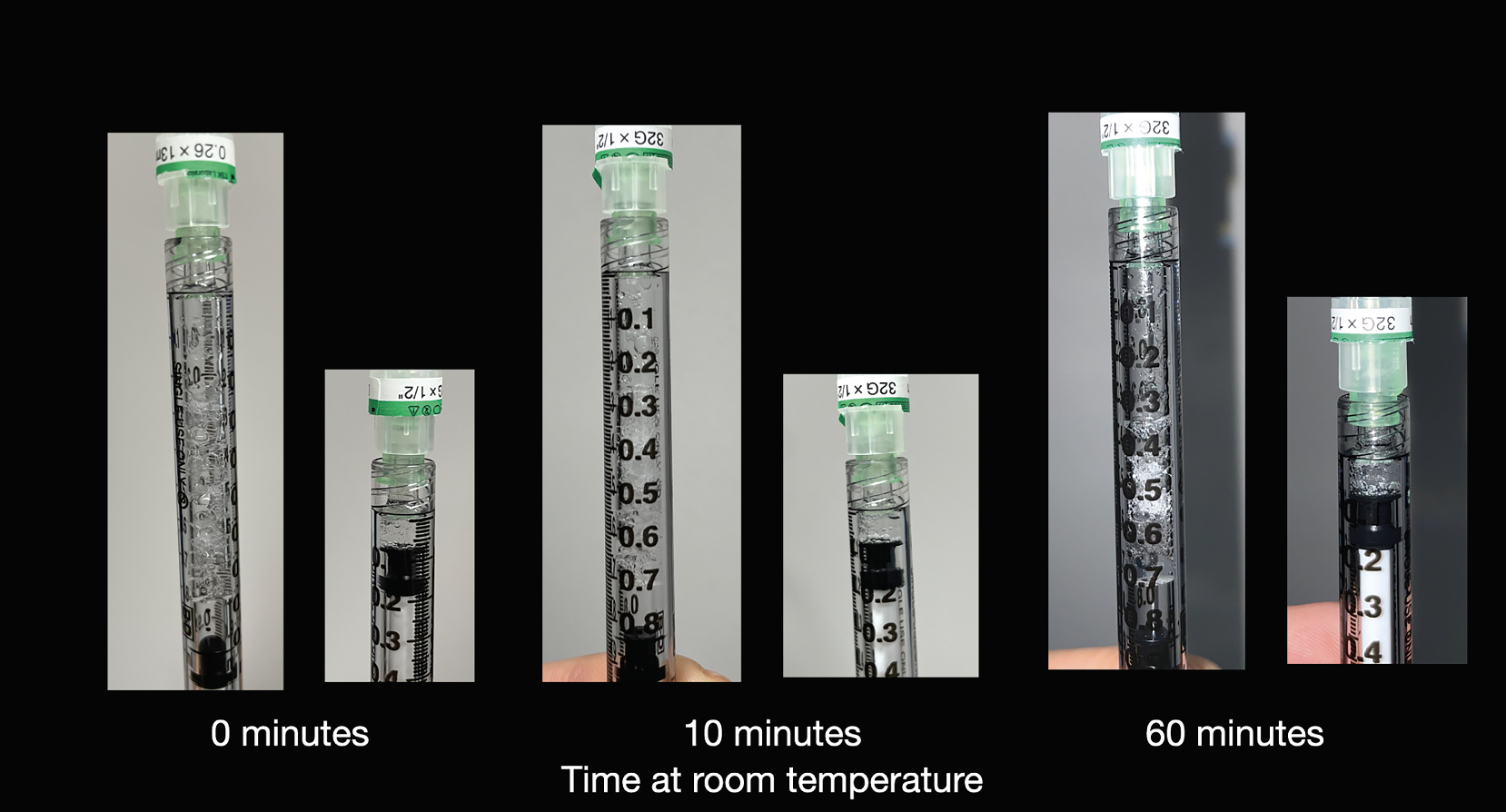 It’s been anecdotally speculated that, at room temperature, the drug will be more easily drawn up with fewer trapped air bubbles. We put this hypothesis to the test, comparing three vials of faricimab. All variables were the same except for the duration of time the drug was left at room temperature. Vial 1 was taken out of the refrigerator and immediately drawn up into a TB syringe. Vial 2 was kept at room temperature for 10 minutes prior to being drawn, and vial 3 was kept at room temperature for an hour prior to being drawn. The same physician performed the procedure all on three vials. There was no visible difference in the volume of trapped air bubbles, the number of times the syringe had to be tapped to let out the trapped air bubbles, ease of priming the syringe or the speed of injection. (See Figure 1)