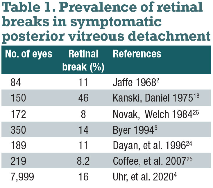 A retinal break is present in up to 16 percent of acute, symptomatic PVDs (Table 1).2-5 If no retinal break appears upon presentation of acute, symptomatic PVD, there’s a 2 percent rate of a retinal break in the subsequent weeks.1