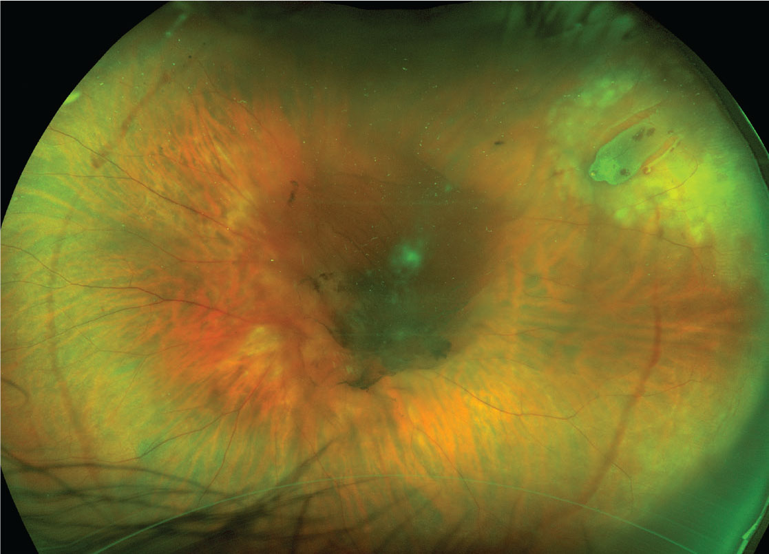 | Figure 1. Symptomatic posterior vitreous detachment with retinal break. There is a central area of vitreous hemorrhage and peripheral hemorrhage that demarcate the circumferential extent of PVD. The break has a cuff of subretinal fluid. Laser photocoagulation burns barricade the break to the ora serrata. Visual acuity was 20/400. |