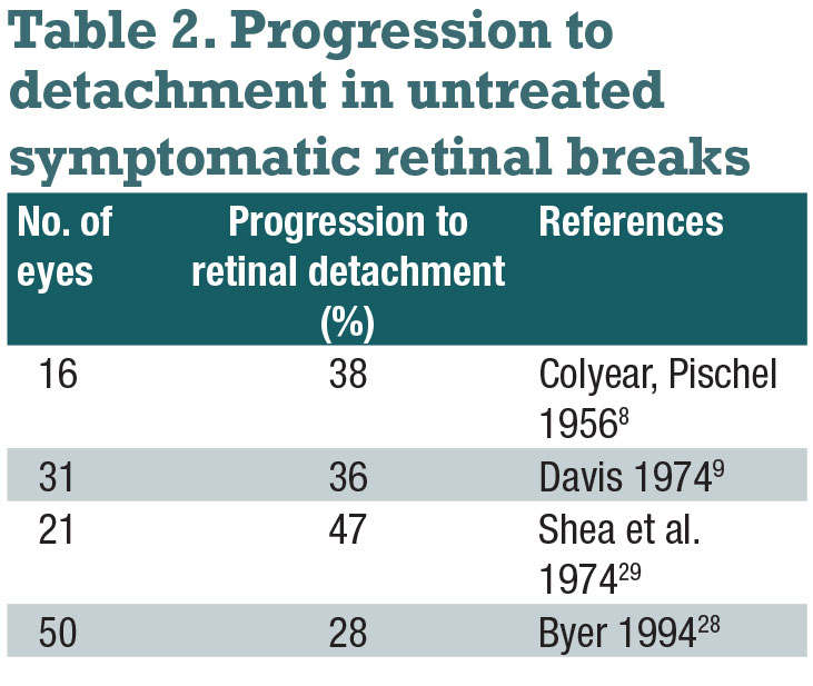 Untreated, symptomatic horseshoe tears are reported to lead to RD in 30 to 50 percent of cases (Table 2).9,10 Retinal break features that are particularly high risk for progression to RD include breaks of acute onset, superior location, large size and surrounding subretinal fluid.