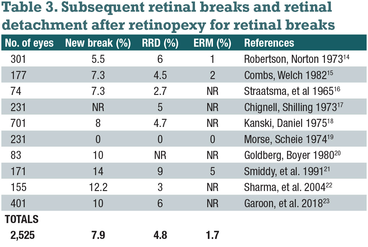 Subsequent retinal breaks occur after treatment of the first retinal break in 5 to 14 percent of eyes (Table 3). About half of subsequent breaks occur within four to six weeks, but new breaks may occur months or even years later.5