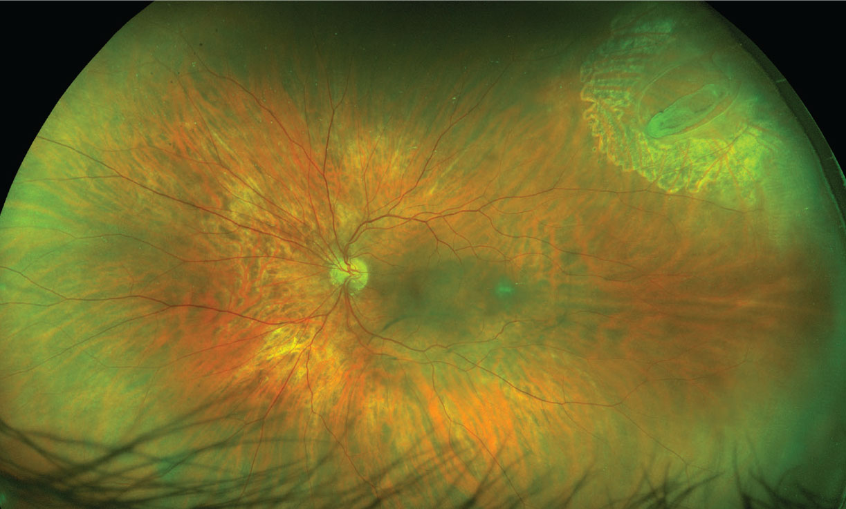 | Figure 2. Three months after retinopexy, no retinal detachment and no new retinal breaks have occurred, and the vitreous hemorrhage has resolved. Visual acuity is 20/20. |