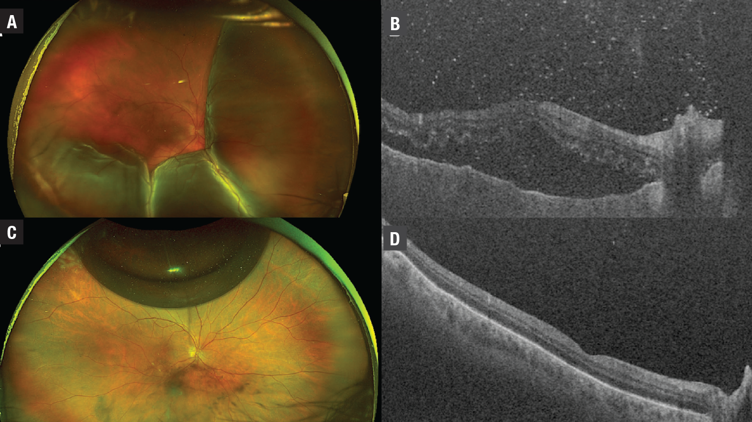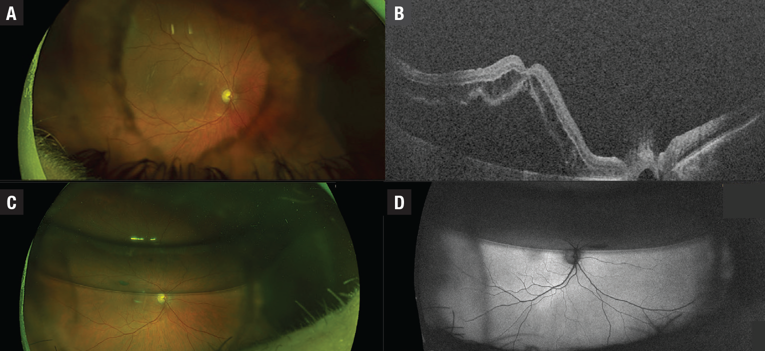 Figure 2. Representative case of a 65-year-old patient with a macula-off rhegmatogenous retinal detachment with an associated choroidal serous detachment and posterior vitreous detachment grade A with superior and inferior breaks (A and B). On day four following preoperative gas, the choroidal detachments resolved and the macula reattached with persistent fluid inferiorly due to inferior breaks and good laser barricade around the superior break (C and D). The patient underwent pars plana vitrectomy on day five following the initial presentation. |