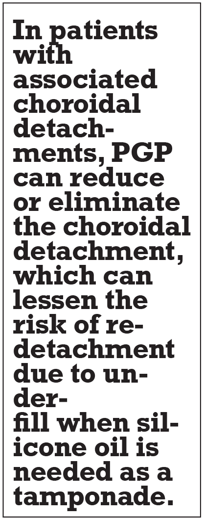 In patients with associated choroidal detachments, PGP can reduce or eliminate the detachment, which can lessen the risk of redetachment due to underfill when silicone oil is needed as a tamponade. Additionally, PGP can often partially resolve a choroidal detachment, which can diminish the likelihood of placing the trocars or infusion cannula in the suprachoroidal space (Figure 2).