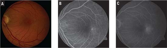 | Figure 1. Color fundus photograph of the left eye (A) demonstrates non-tapering and angled venues, subtle perifoveal translucency and intraretinal crystals concentrated on the temporal edge of the fovea. Early phase fluorescein angiogram (FA) of the left eye (B) shows reduced and telangiectatic capillaries with subtle hyperfluorescence on the temporal edge of the fovea. Late-phase FA (C) demonstrates characteristic hyperfluorescence on the temporal edge of the fovea. |
