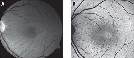 | Figure 2. Blue light reflectance (ie, red free) image (A) shows hyper-reflectivity on the temporal edge of the fovea with a ring of subtle hyper-reflectivity throughout the perifovea. These images also illustrate the nontapering angled venules well. Fundus autofluorescence of the left eye (B) shows hyper-reflectivity on the fovea’s temporal edge. |