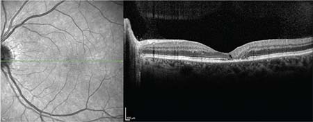 In addition, spectral domain optical coherence tomography (SD-OCT) may reveal hyporeflective cavities (ie, cavitations) involving the inner and/or outer retinal lamellae and ellipsoid zone attenuation (Figure 3). Although the entire perifovea may be involved, the findings are nearly always observed in at least the temporal edge of the fovea and may be asymmetric between the eyes.