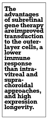In this vein, a minimally invasive subretinal delivery system, called Orbit, is being designed to deliver subretinal therapy via a suprachoroidal approach. This may improve precision and predictability of delivery and overcome the challenges associated with the traditional surgical-based approach. This delivery system is being tested in cohorts 5 through 7 of the FOCUS study.