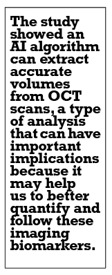 The algorithms analyzed more than 20,000 scans from these datasets and made quantitative measures of IRF, SRF and PED volume. This study showed that an AI algorithm can efficiently extract accurate volumes from OCT scans. This type of analysis can have important implications in our clinical practice and research as it may help us to better quantify and follow these imaging biomarkers.