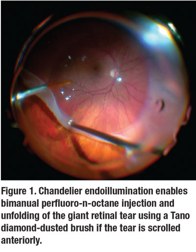 Next, PFO is gradually injected as a single bubble over the optic disc, taking care to ensure the dual bore cannula remains within the bubble as it expands. We sometimes use chandelier endoillumination to allow for bimanual PFO injection and unfolding of the GRT using a Tano diamond-dusted brush if the tear is scrolled at its anterior edge (Figure 1, page 9).