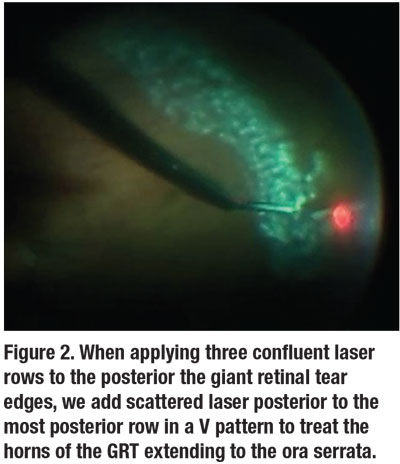 Next, we apply three confluent rows of laser to the posterior edges of the GRT. We like to also add scattered laser posterior to the most posterior row in a V pattern to treat the horns of the GRT extending to the ora serrata (Figure 2). Doing so prevents guttering of subretinal fluid and recurrent RRD. We often also add two rows of laser 360 degrees close to the ora serrata.