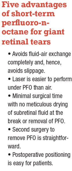Even a direct PFO-silicone oil exchange still carries an opportunity for slippage because removal of PFO can result in some change in the position of the GRT and subsequent slippage. A short-term PFO tamponade avoids this risk completely and is our preferred technique.