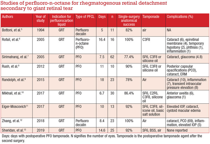 In a literature review,5–13 postoperative PFO was removed on average at day 10.84. Most authors compared the advantage of longer-term tamponade with the possibility of PFO retinal toxicity in the form of outer plexiform changes, retinal compression, and cited complications such as elevated IOP and inflammation.