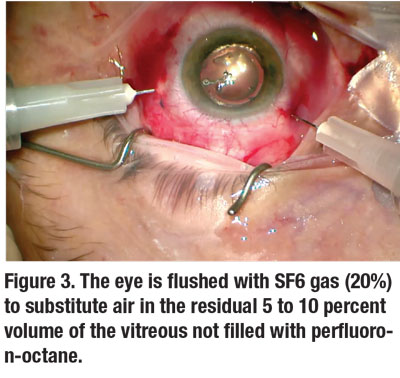 The eye is then flushed with SF6 gas (20%) to substitute air in the residual 5 to 10 percent volume of the vitreous not filled with PFO (Figure 3). We routinely close the sclerotomies with sutures to prevent any subconjunctival migration of PFO that would result in an underfill.