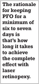 The rationale for keeping PFO for a minimum of six to seven days is that’s how long it takes to achieve the complete effect with laser retinopexy.
