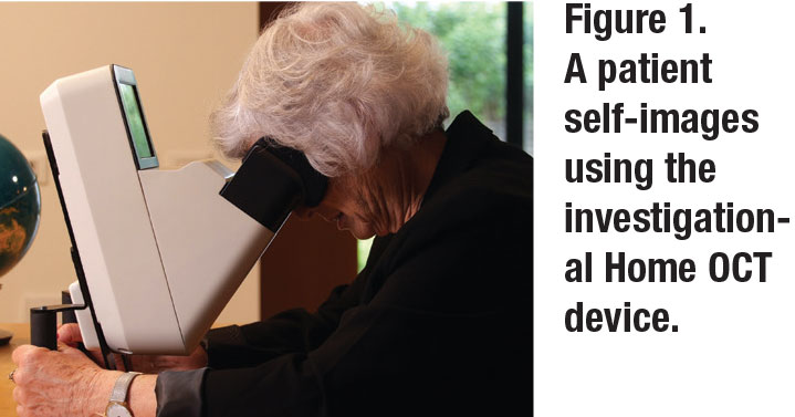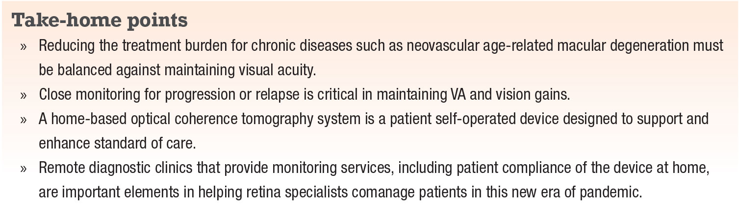 The diagnostic clinic provides the device to the patient following a physician referral. The remote clinic educates the patient about device use, monitors patient self-imaging compliance and can send reminders if the patient isn’t self-monitoring. Thus, home-based OCT may be a solution for reducing the burden of coming to the office for patients while they’re being safely monitored remotely. It may also increase the chances of timely detection of recurrent fluid and prompt a visit for intravitreal injection, thus reducing the risk of VA loss.