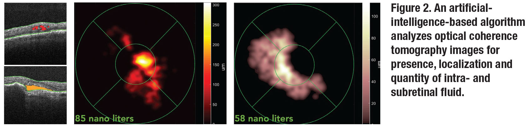 To cope with the large amount of daily Home OCT images that require analysis, an artificial-intelligence-based algorithm that identifies, localizes, quantifies and maps fluid on each scan has been developed (Figure 2). It can track intra- and subretinal fluid over time and enables the physician to set thresholds for sending automated alerts. We can look at fluid in isolation regardless of retinal alterations like fibrosis that can mask disease activity on retinal thickness maps.