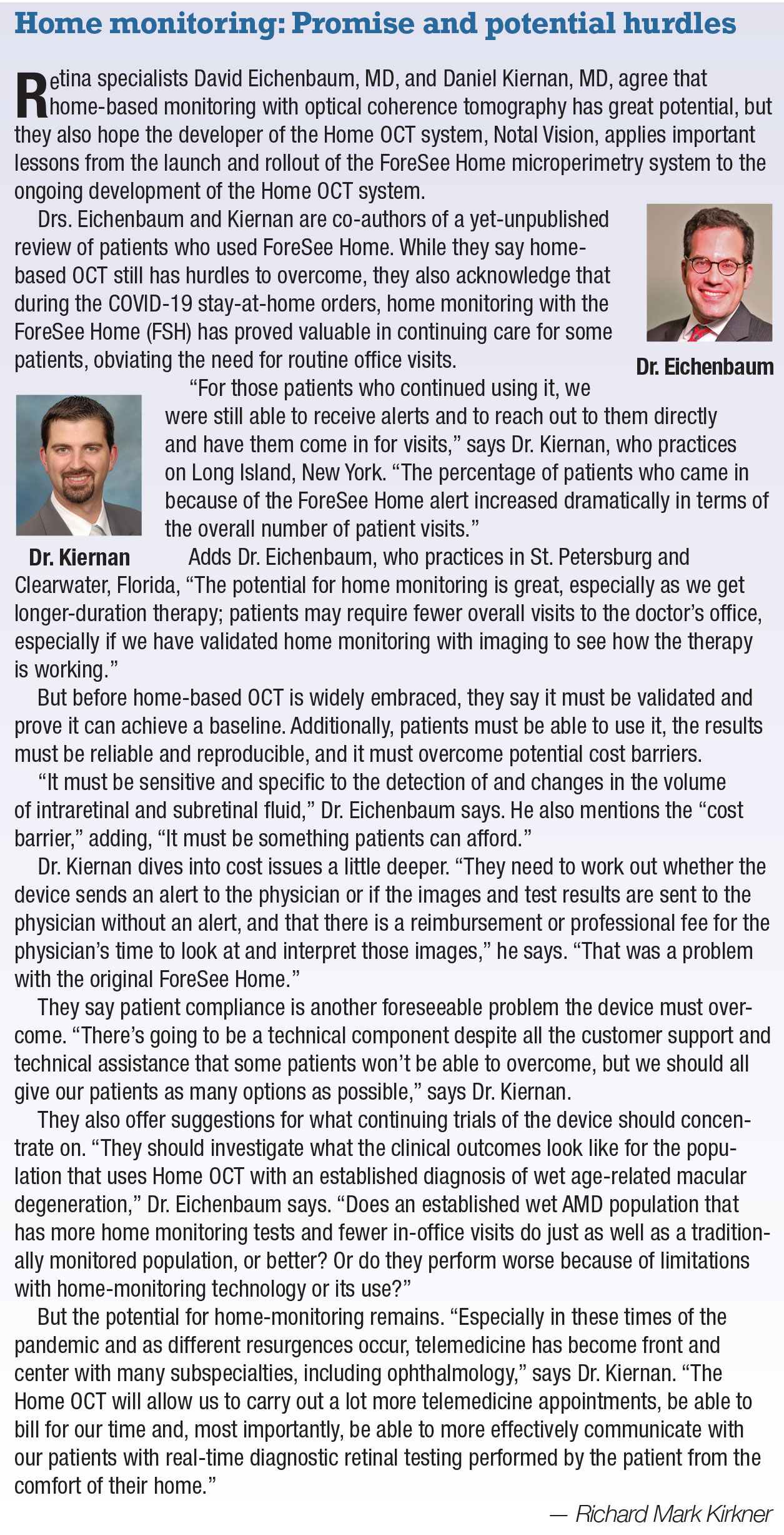 At the same time, the ability to remotely review images by retina specialists could allow us to engage directly with our patients on telehealth consultations. Extreme times such as these require innovative thinking and adaptability to provide the best care. Technologies such as Home OCT may help us to do so as we move forward. If all goes well, the remote monitoring service is expected to be available in the United States by prescription in the first half of 2021. RS