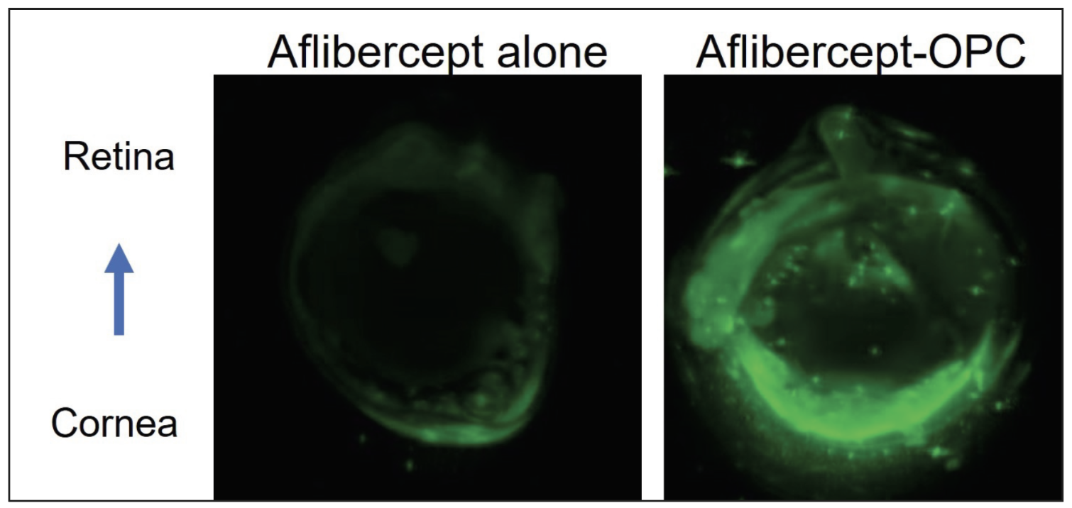 Several OPCs demonstrated what the investigators described as relatively high intraocular penetration of aflibercept in mouse and pig eyes. In mice with laser-induced CNV, the aflibercept drop showed a decrease in leakage, lesion volume and area with efficacy similar to intravitreal injection: a 24.9-percent reduction of leakiness with intravitreal injection and 20.1-percent reduction with OPC compared to control. The company is also investigating topical formulations of brolucizumab, ranibizumab, bevacizumab and faricimab.