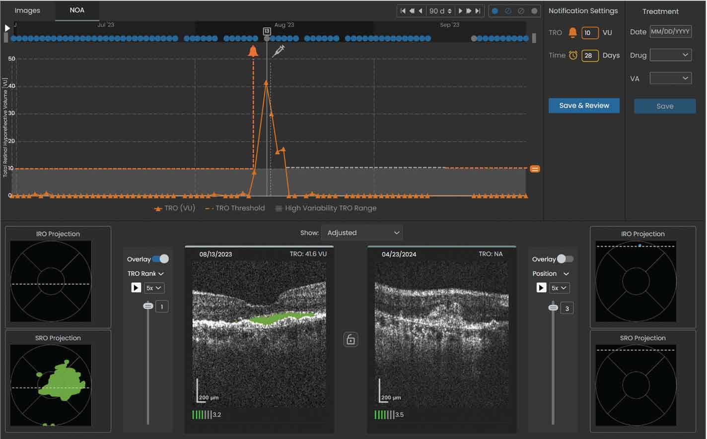 Figure 3. Sample volume trendline showing a notification was sent to the reviewing physician when the total retinal volume crossed the set threshold of 10 µL. The left OCT scan shows the total retinal volume reached a maximum of 41.6 µL within the specified 90-day window on 08/13/2023 and was predominantly SRF (denoted by the shaded green area). |