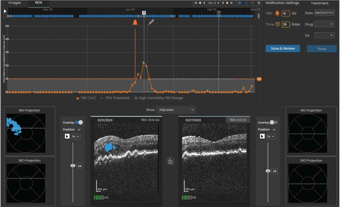 Vision Home OCT (NVHO, Notal Vision) device, which uses an AI algorithm called Notal OCT Analyzer (NOA) to measure SRF and IRF daily.6 The device, called the Scanly Home OCT, was subsequently approved by the FDA in May 2024.