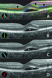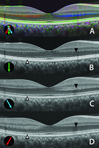 ![]() | Figure 1. Directional optical coherence tomography (D-OCT) in a normal subject. A) Chromatic hybrid D-OCT showing directionally reflective structures in colors related to the pupil entry position that gives maximal reflectivity. Ellipsoid zone (EZ) and interdigitation zone (IZ) appear as green because the green channel is from light entering through the center of the pupil; the Henle fiber layer (HFL) is red and blue because its maximal reflectivity varies based on which side of the pupil light enters. Areas with equal reflectivity at each pupil entry position appear as grayscale as the colors from each individual scan cancels out. B) Standard central light entry position shows maximal IZ and EZ reflectivity (white arrowhead) and moderate HFL reflectivity (black arrowhead). C) Light entering from left pupil shows markedly decreased IZ reflectivity and moderately reduced EZ compared to B (white arrowhead) and maximal HFL reflectivity (black arrowhead). D) Light entering from the right pupil also shows decreased outer retinal band reflectivity (white arrowhead) and minimal HFL reflectivity (black arrowhead). | | Figure 2. Directional optical coherence tomography (D-OCT) in a patient with central serous chorioretinopathy and subretinal fluid. A) Chromatic hybrid D-OCT shows directionally reflective structures in colors related to the pupil entry position that gives maximal reflectivity. Ellipsoid zone (EZ) and interdigitation zone (IZ) reflectivity follows the pattern of normal green appearance away from the area of subretinal fluid (white arrowheads). In the area of active subretinal fluid, the EZ and IZ are shown in a rainbow of colors indicating a change in alignment caused by the fluid. The colors that predominate are those that relate to the pupil entry positions toward which the photoreceptors are oriented. The variable reflectivity from the IZ and EZ are shown in B-D (white arrowheads). The Henle fiber layer (HFL) demonstrates the normal appearance in the temporal and nasal retina, but overlying the subretinal fluid, the geometry is altered in a way that the HFL appears flat and brightest in the green central channel. |