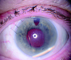 | Figure. In this eye with an anterior chamber intraocular lens, the dexamethasone implant has migrated into the anterior chamber and corneal edema is present. (Image courtesy of David J. Parks, MD) |