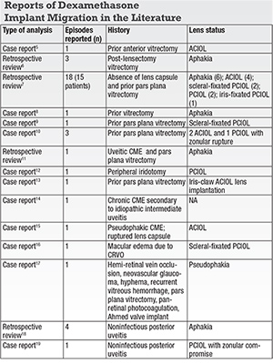 Anterior chamber migration of the DEX implant was first reported in a vitrectomized eye with an ACIOL and then in aphakic vitrectomized eyes.5,6 Subsequently, cases involving PCIOLs were also published.8-10 In contrast, the Phase III clinical studies involving the DEX implant for RVO and DME reported no cases of anterior chamber migration of the steroid implant in 2,335 patients.1,3 However, the exclusion criteria for entry into the study included aphakia or ACIOL.