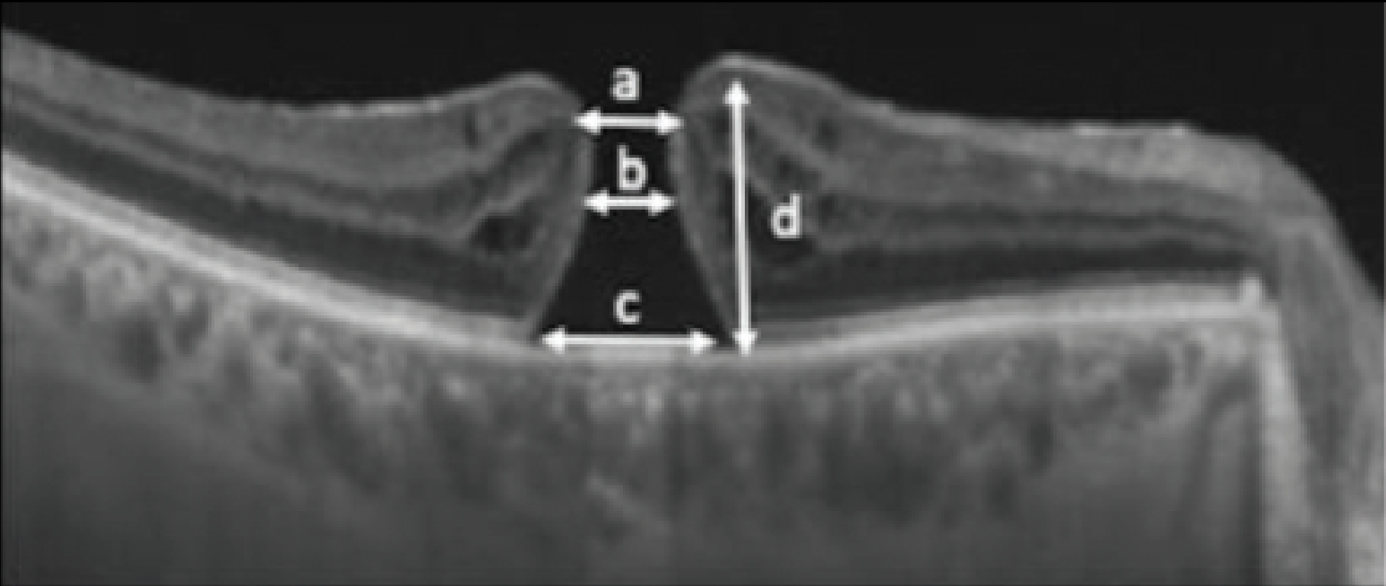 Figure 1. A diagram of full-thickness macular hole parameters: a = apical diameter; b = minimum diameter; c = basal diameter; and d = height. (Reprinted with permission from Uwaydat SH, Mansour A, Ascaso FJ, et al. Clinical characteristics of full thickness macular holes that closed without surgery. Br J Ophthalmol. 2022;106:1463–1468.)3 |