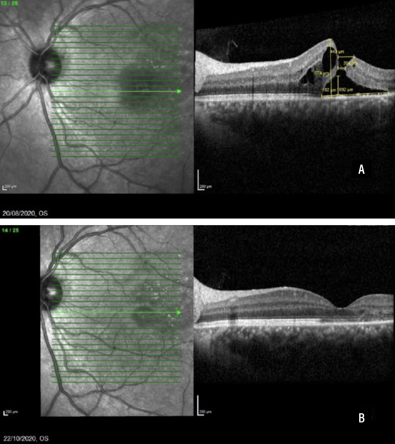 | Figure 2. Spectral-domain optical coherence scans before full-thickness macular hole closure (A) and two months after closure (B). This 24-year-old White male sustained a sports injury and was started on topical NSAID. Visual acuity improved from 6/12 (20/40) to 6/6 (20/20). (Reprinted with permission from Uwaydat SH, Mansour A, Ascaso FJ, et al. Clinical characteristics of full thickness macular holes that closed without surgery. Br J Ophthalmol. 2022;106:1463–1468.)3 |